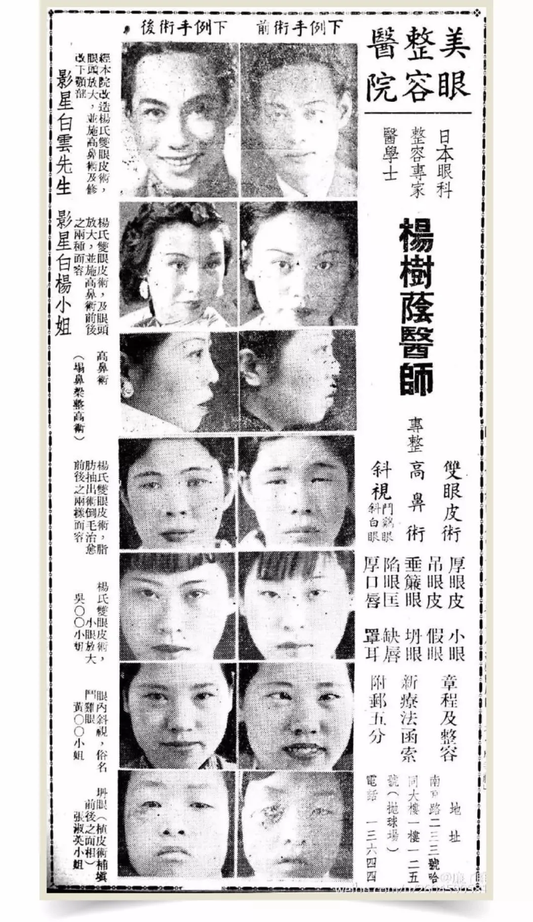正是因为名流的撑腰,比起现代整容医院各种隐晦的宣传词,那时整形机构的广告语来得理直气壮、清晰直白: