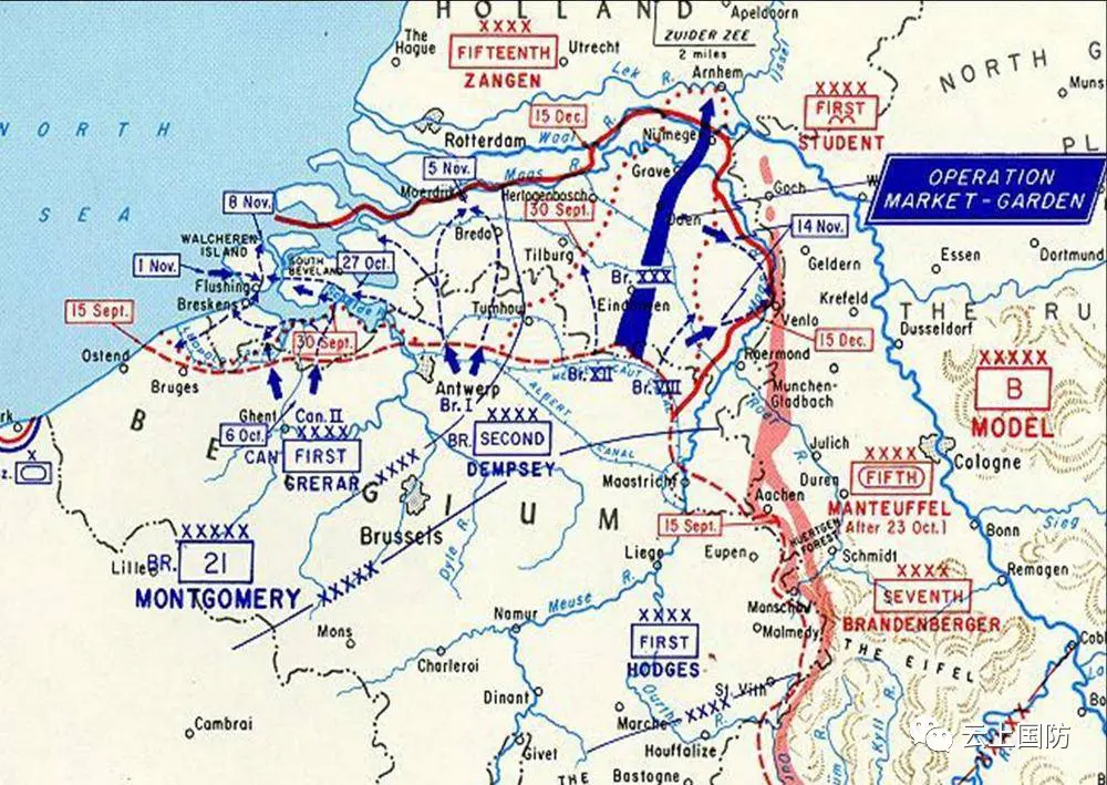 虽然受到后勤补给的制约,盟军进攻的锋芒有所削弱,但是随着巴顿率领的美第3集团军在法兰西平原上对撤退德军的大规模追击作战的顺利进行,盟军上下先前弥漫的乐观情绪又有所抬头。为了从北面迂回齐格菲防线,直取德国鲁尔工业区,以便在“圣诞节前结束战争”(西方老拿圣诞节说事,1950年麦克阿瑟也这么说),一向以谨慎著称的英军蒙哥马利元帅,继先前受到天气的影响而被取消的“彗星行动”后,又提出了一个代号为“市场花园”的大胆而冒险的计划。这一行动旨在夺取跨越莱茵河、瓦尔河等河流上的一系列重要桥梁后,从荷兰直插德国腹地,争取在1944年圣诞节前结束欧洲战场作战。