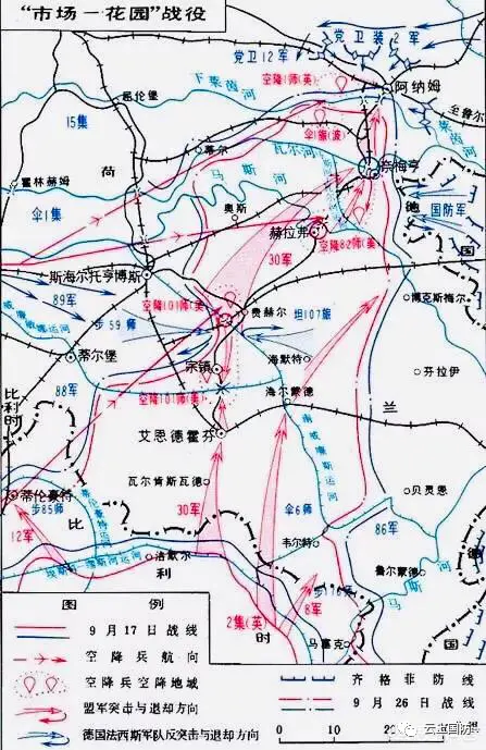 “市场花园“战役示意图,蓝色箭头为英军进攻方向,直指阿纳姆