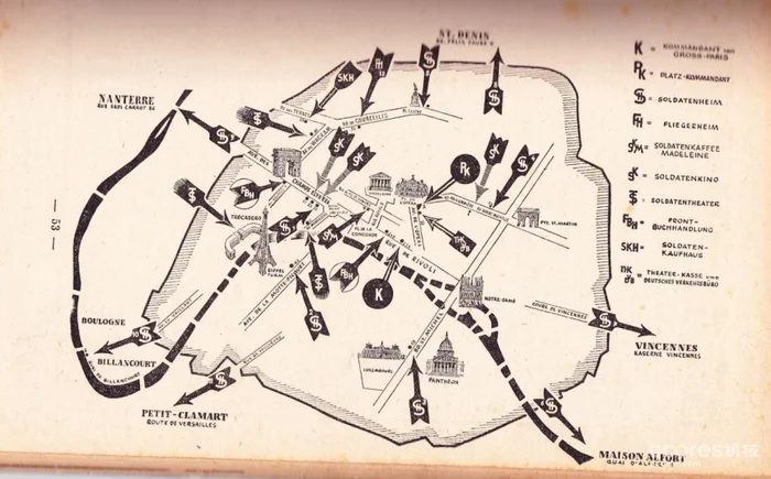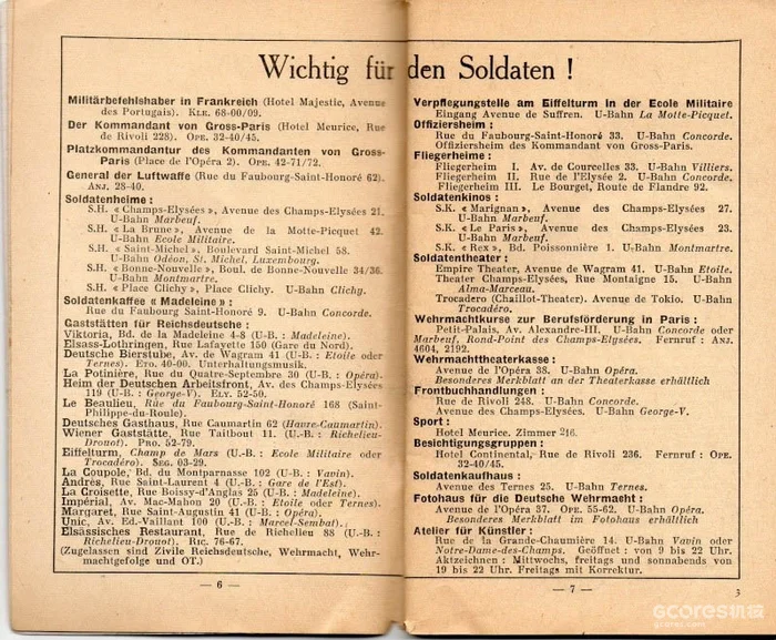 法国投降,巴黎变成了德国军人的游乐场。图为一本供德国军人使用的休假手册,包含了各驻军部门以及巴黎各电影院、餐厅、咖啡店、妓院、旅馆等地点的详细位置。