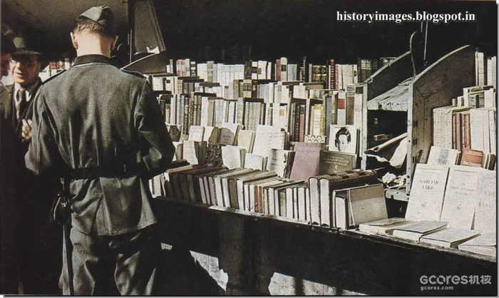 在逛书摊的德国士兵,整个巴黎也只剩德国军人有购买力可言。