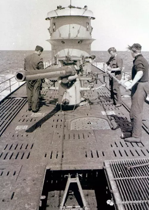 ■ U-103号于1939年在不莱梅威悉船厂下水,二战中获得过237596吨击沉战绩,前后有过5任艇长,最终于1945年5月3日在基尔被凿沉。图为战争期间在该艇上拍摄的一张照片,艇员们正在维护甲板炮,其舰桥上可见两个S字艇徽,这是其首任艇长许策的姓氏首字母。
