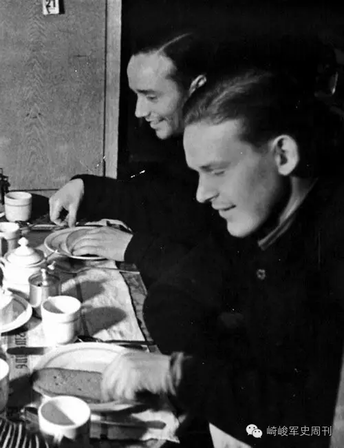 ■ U-103号上,奥斯卡·库施(前)正在军官餐厅吃饭。