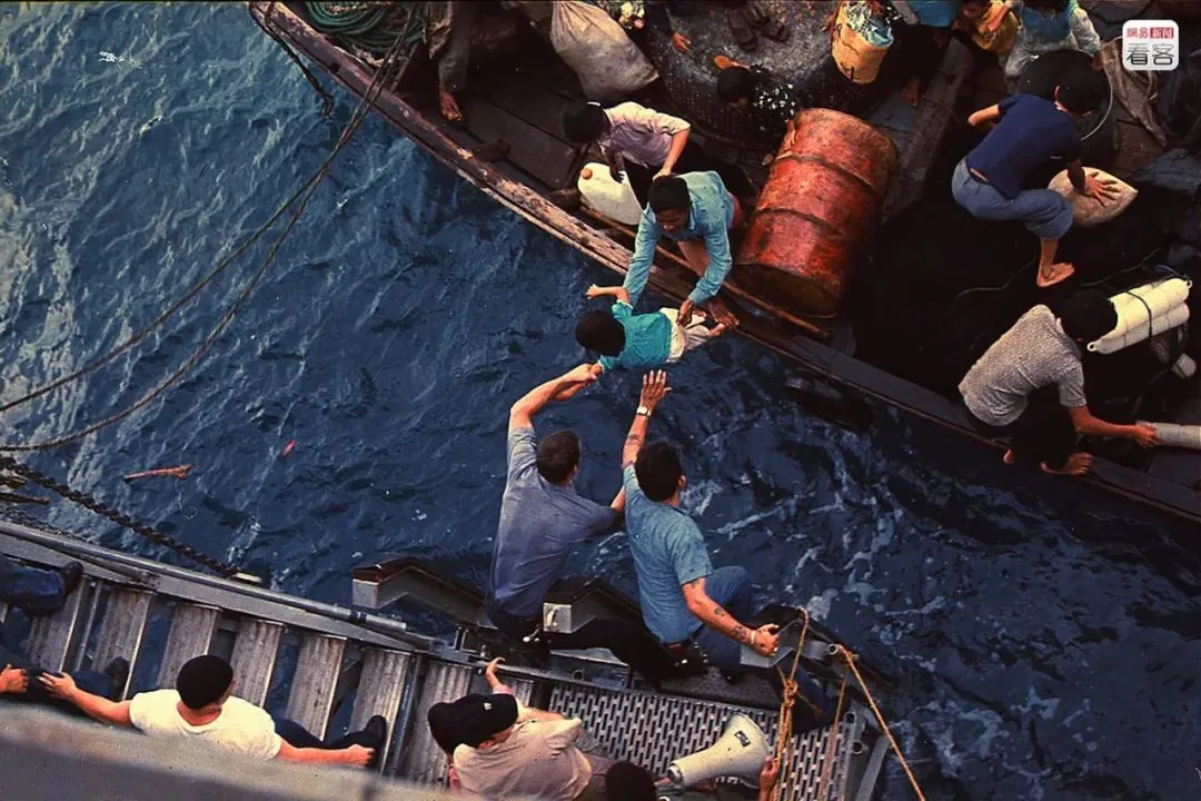1975年4月,越南难民乘船逃离国家,在西贡附近的南海上靠近美国军舰寻求庇护