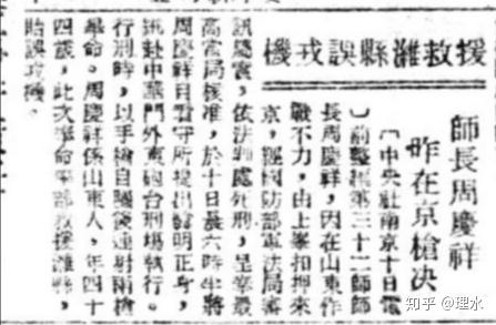 前整编第三十二师师长周庆祥,因在山东作战不力,由上峰扣押来京,经国防部军法局审讯属实,依法判处死刑。呈奉最高当局核准,于十日晨六时半将周庆祥自看守所提出验明正身,绑赴中华门外东炮台刑场执行。行刑时,以手枪自脑后连射两枪毕命。周庆祥系山东人,年四十四岁,此次奉命率部救援潍县,贻误戎机。