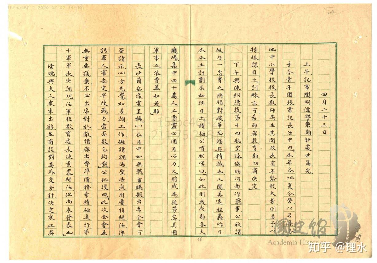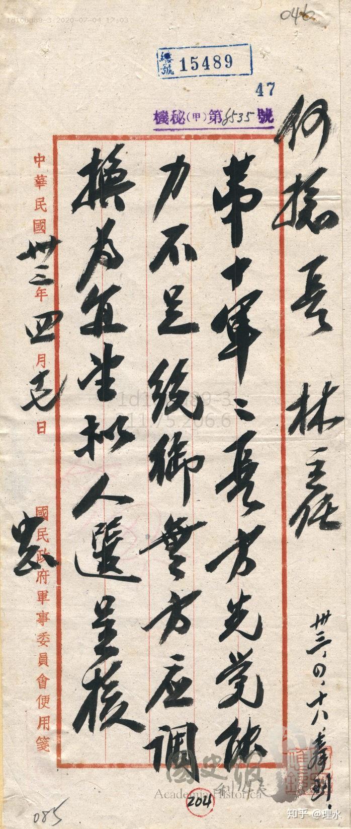 何总长,林主任: 第十军军长方先觉,能力不足,统御无方,应调换为宜。望拟人选呈核。 卅三年四月十七日。中正。