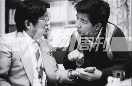 1989年秋,上海淮海中路,剧作家沙叶新(右)在家中为魏明伦看相