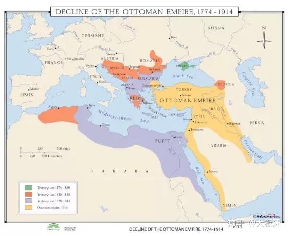 彩色部分全体为奥斯曼全盛时期疆域,然而到1914年只剩下了黄色部分