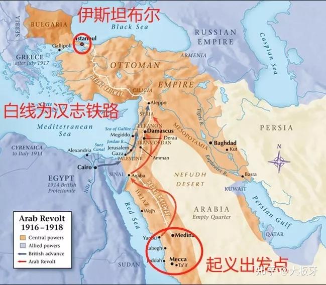 阿拉伯大起义从麦地那-麦加出发北上(红线为起义路线),重点破坏汉志铁路
