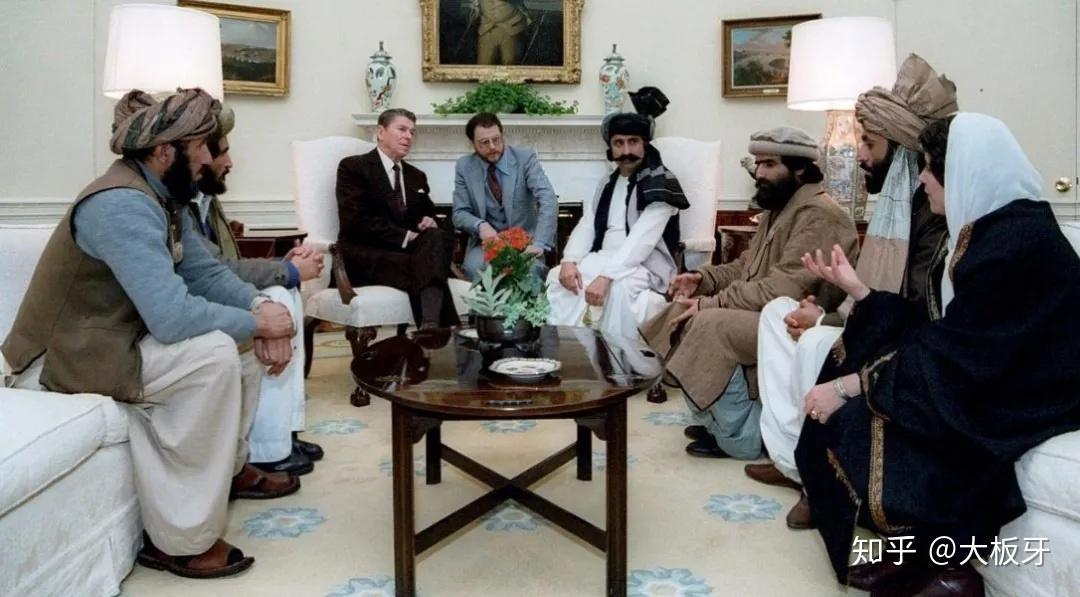 为了给圣战者造势,1983年里根还在白宫椭圆形办公室会见了圣战领袖并合影留恋,且充分发挥昔日练就的台词功底,声情并茂地表示:“观看这些无畏的塔利班自由战士用手持武器对抗现代兵器的场景,真是让所有热爱自由的人动容!”