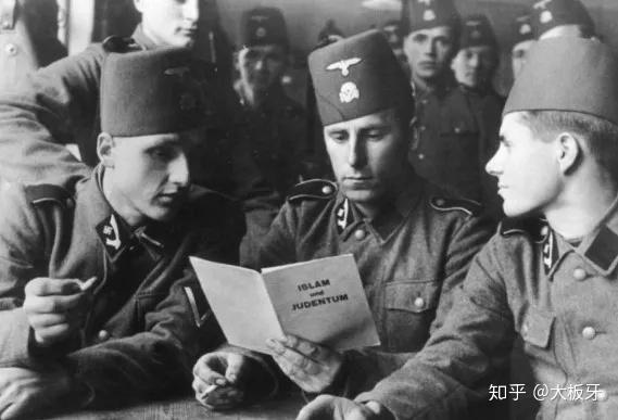 为了表忠心,侯赛尼还与希特勒联合建立了一支阿拉伯纳粹部队。这支部队的士兵戴着具有阿拉伯风格的军帽,肩章上刻着纳粹万字标志,下图中的他们正在阅读一本名为《犹太教与伊斯兰教》的宣传读物。书中,犹太教被描绘为伊斯兰教不共戴天的死敌。