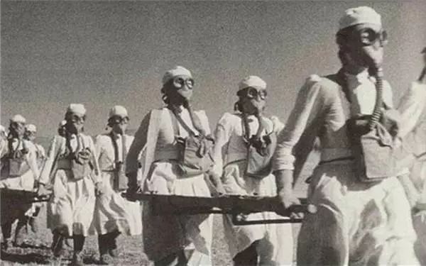 军事化的训练。带着防毒面具的伪满护士学校的女学生