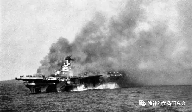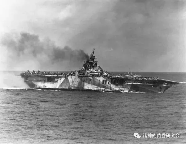 该舰被第一次击中后不久的情景,摄于“迈阿密”号轻巡洋舰(USS Miami CL-89),前景中为停在巡洋舰右舷弹射器上的OS2U“翠鸟”式水上飞机(OS2U Kingfisher)。