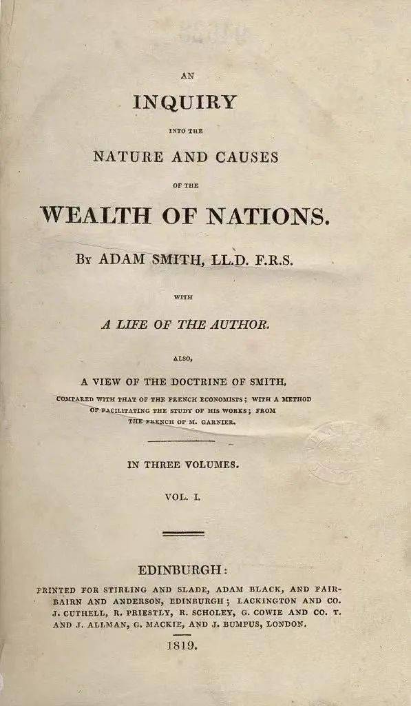 亚当·斯密著《国富论》,全称《国民财富的性质和原因的研究》(来源:wikipedia.org)