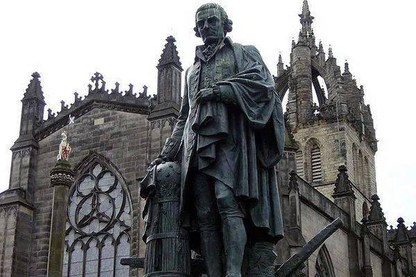 在阐述亚当·斯密的思想前,杰西·诺曼意味深长地谈起矗立在爱丁堡街头的斯密像:“今天,如果你沿着爱丁堡老城的皇家大道,从修士门外亚当·斯密故居往上,向海关大楼的方向走,你会经过两座伟大的雕像。第一座是由公众捐款集资建设的亚当·斯密雕像,高大而光辉,矗立在圣吉尔斯大教堂外。他的身后是一把旧式犁,身旁是一个蜂巢,象征着农业社会向商业社会和市场经济的过渡。他的左手捏着长袍,暗示他投入大部分时间的学术生活。他的右手不怎么显眼,也被称为‘看不见的手’,搁在一个地球仪上,委婉地提示着观众他作为知识分子的野心和世界性的声誉。”另一座“伟大雕像”是哲学家大卫·休谟的塑像。它们都是英国当代艺术家亚历山大·斯托达特(Alexander Stoddart)的作品。斯托达特当然没有见过斯密,也无从知道斯密的真实面貌,因为斯密没有留下任何画像。他只能根据世人想象中的斯密身影进行创作,刻画出人们心目中的斯密。所以,这座雕像是当代人心灵的投射,呈现了今人对斯密的理解。杰西·诺曼解释了长袍、地球仪、旧式犁和蜂巢所代表的隐喻:这些符号暗示了他的哲人身份、世界声誉,及其时代背景。隐藏起来的右手则象征着他的哲思——这是一只“看不见的手”。实际上,如果把其他符号都撤掉,仅仅保留这只“看不见的手”,我们就能把他认出来。对现代人来说,“看不见的手”不只是一种修辞,它甚至变成了一种信仰或意识形态。