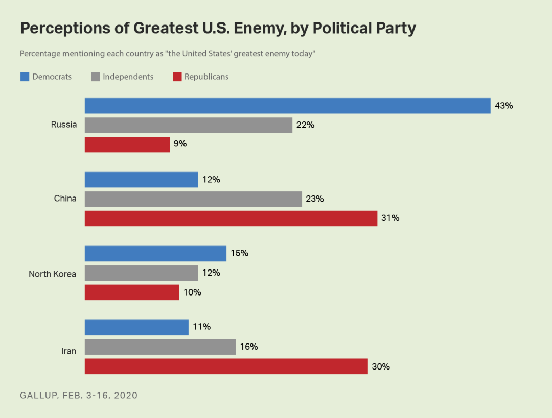 美国政党如何定义美国的敌人,蓝色代表民主党、红色代表共和党、灰色代表无政党立场的中间人士