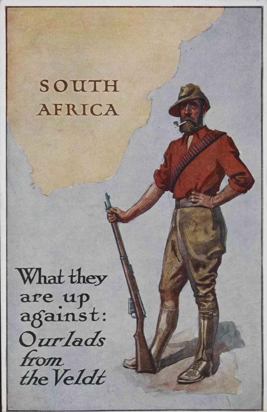 20世纪上半叶的一张明信片,上面描绘了一个布尔人和南非的地图剪影。图中亲切地将南非布尔人称为:“我们来自南非大草原的小伙子。”