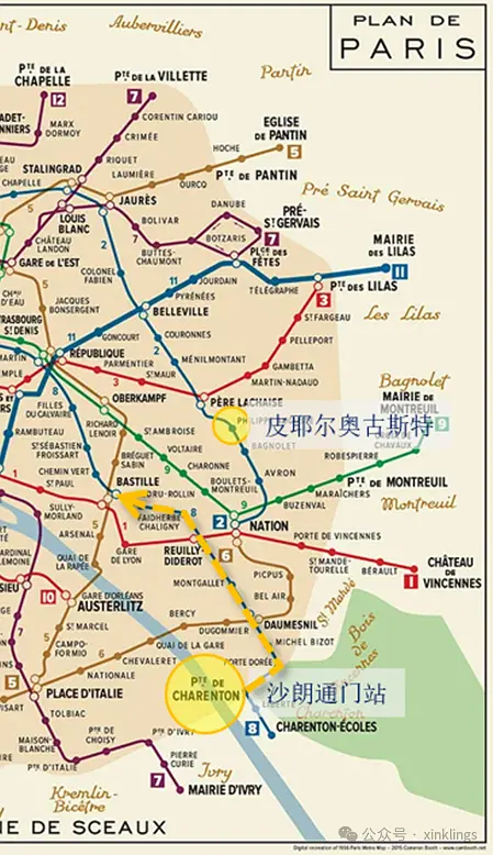 (莱蒂西亚从沙朗通门站上车,沿8号线向北(虚线所示),准备在皮耶尔奥古斯特站下车,需要搭乘巴士)