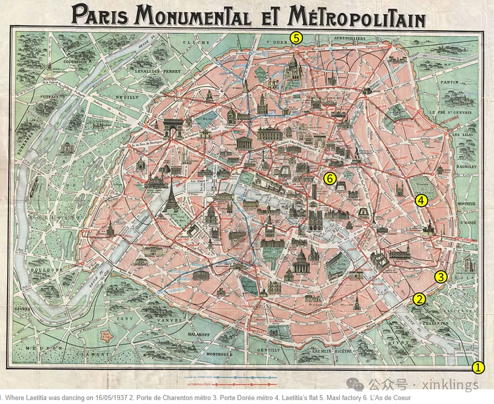 (莱蒂西亚相关地点:1为遇害当天跳舞的场所,2为她上车的沙朗通门站,3为被发现遇害的镀金门站,4为她所租住的公寓,5为蜡厂,6为红心王牌夜店)