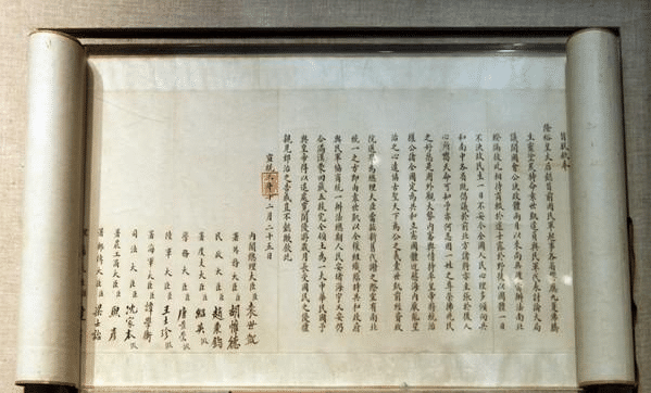 1912年2月12日(夏历辛亥年,清宣统三年十二月二十五日),清朝末代皇室颁布了清帝逊位诏书。全文如下: