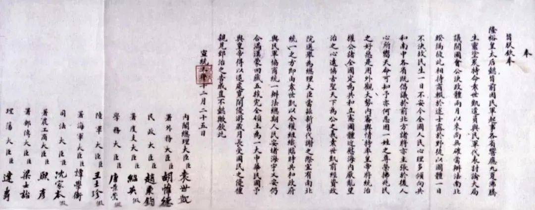 上谕:朕钦奉隆裕皇太后懿旨:前经降旨,召集国会,将国体付诸公决。查比年以来,各省迭被灾祲,小民生计维艰。转瞬春耕,长此兵连祸结,四民失业,盗贼蜂起,荼毒生灵,岂牧民者所忍膜视。又何忍争一姓之虚荣,贻万民以实祸,致与古圣民为邦本、先贤民贵君轻之训大相剌谬。用是,外观大势,内察舆情,自应将权位公诸天下,即定为共和立宪国体,以期回复秩序,海宇乂安。在朝廷无私天下之心,在中国当作新民之始。必须慎重将事,以谋幸福而奠初基。应即由袁世凯以全权组织临时政府,与民军协商统一办法。总期人民安堵,领土保全,满、汉、蒙、回、藏五族仍能合为一大中国,即为至幸。予与皇帝但得长承天眷,岁月优游,重睹世界之升平,获见民生之熙皞,岂不懿欤。钦此。