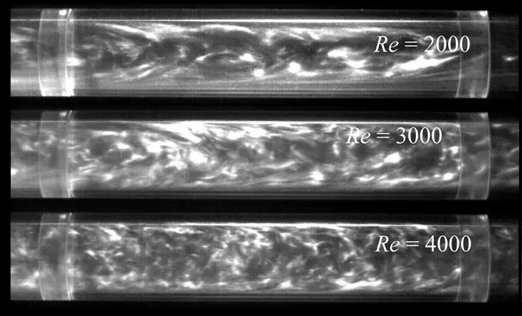 对于研究流体的人来说,雷诺数就像一个压缩包的密码。雷诺数低于1000,流体可以说是粘性的或缓慢的,此时在层流的范畴。在1000到2000之间,流体流动得更快,我们可以引入无序但它会很快消失。雷诺兹观察到,在雷诺数大约在2000左右的时候,流体会发生一个转变:转变了一种更适合形成湍流的状态。在2000到4000之间,管道中湍流流体的比例从接近零增加到了接近100%。