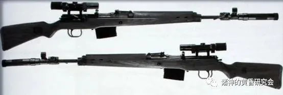一把斯太尔兵工厂(Steyr)生产的K98k狙击步枪,配光学技术公司的4倍瞄准镜。狙击镜以同心调整环安装,通过调节固定在物镜周围的圆环来进行横向调整。由于这种双钩型支架的狙击步枪大量配发给党卫军,所以也称为“党卫军钩支架”