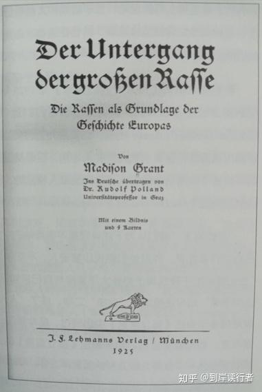 在希特勒的藏书中,可以估量出这本出版于1925年的德语版《伟大种族的消逝》对希特勒的思想的影响。作者是美国的律师、历史学家和人类学家,以研究优生学著称,他主张限制移民,反对不同种族通婚。