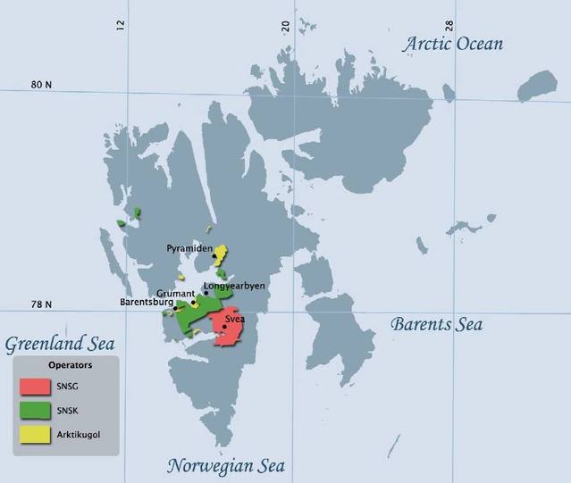 黄色的区域,为俄国公司Arktikugol所有,这家公司至今仍在运营
