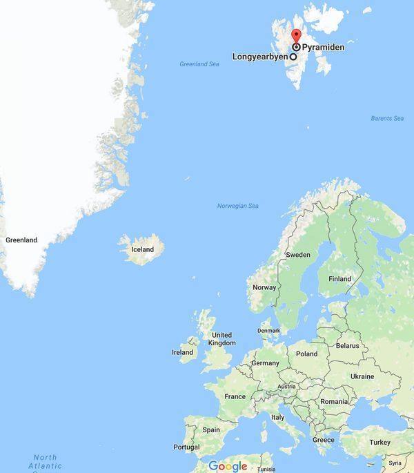 Pyramiden位于斯瓦尔巴德群岛之中,北纬78.39°。往南是北欧三国,往北就是北极点