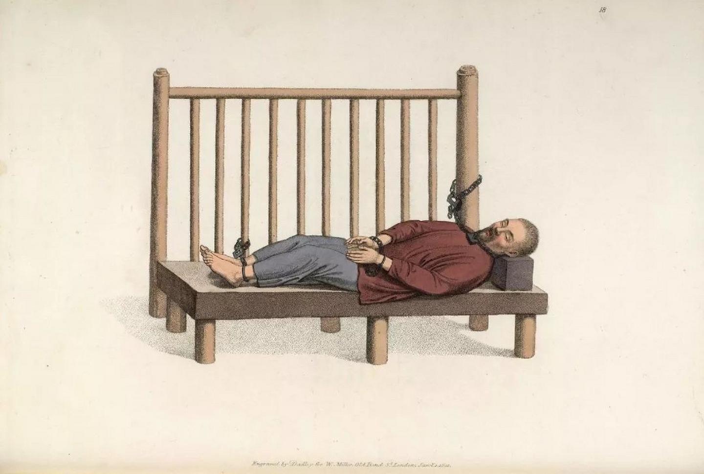 比如上文“雪上加霜”中提到的匣床,这是一种卧式戒具,囚徒仰面躺在像如今的婴儿床一样有围栏的木板上,头发被绕在一个固定于木板的铁环上,脖子、胸口都用铁索锁住,肚子上还压一块压腹木梁,两手被铁环铐住,两足被挖有双孔的匣板套牢。