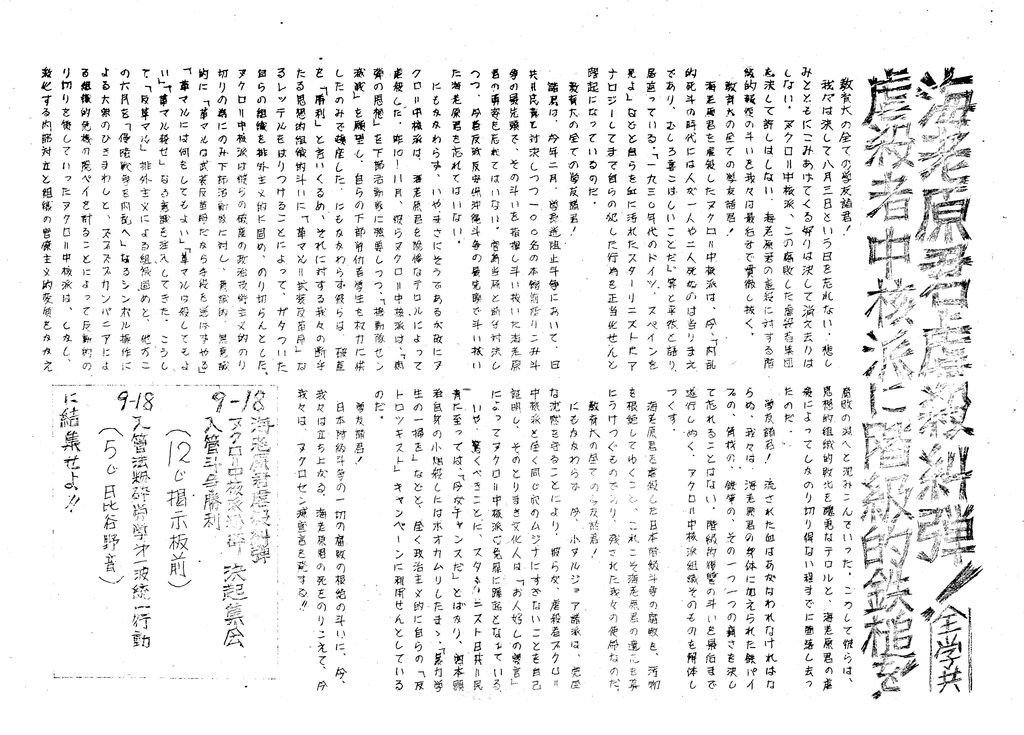 9月17日:中核派袭击了琦玉大学反战联合的成员,反战联合的一名成员被劫持到芝浦工业大学作为人质。