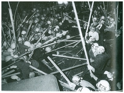 10月8日:在羽田斗争中,解放派和中核派准备了木棍和头盔用于内斗。但是随着机动队介入,双方一致对外对抗机动队。中核派学生山崎博昭在冲突中丧生。