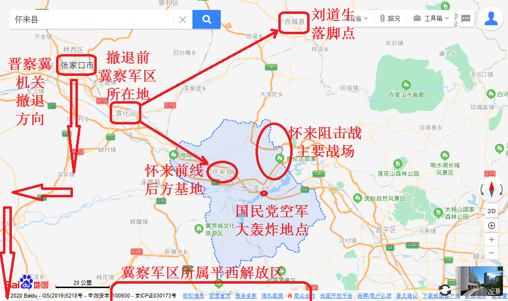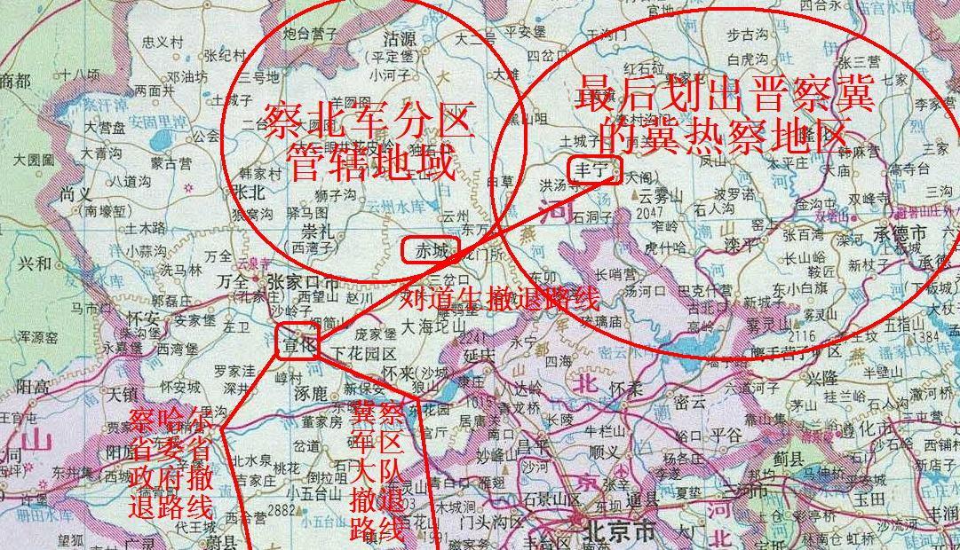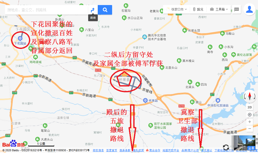而驻宣化的冀察军区及察哈尔省委、省政府撤退,并没有选择走这条路,而是沿铁路线一直往东南,经下花园,走怀来县这条路。走这条路并不是没有先例。1945年8月底,张家口最后一支撤退的日军,因为火车已完全不通,他们就选择步行,从张家口一路向东南,经沙岭子、宣化、下花园、怀来,到达延庆的青龙桥,最后到达南口,与等在那里的日军大队会合。