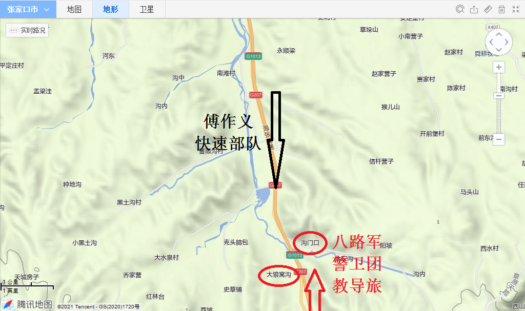 张北县城失守消息传到张家口,张家口空虚,聂荣臻立即派李湘、张明河教导旅火速赶到位于张北与张家口之间的天险狼窝沟一线抗击敌人。这个张家口教导旅,前身是冀晋军区主力组成的赵尔陆纵队一旅,旅长李湘,在平西挺进军肖克的手下干过;张明河的前任旅政委曾美,今天还在世,是晋察冀出了名的几个百岁老将军之一。