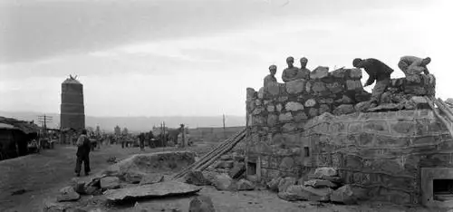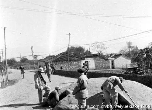 正在太原前线阵地警戒的阎军士兵,其前方为一座蘑菇碉