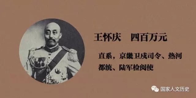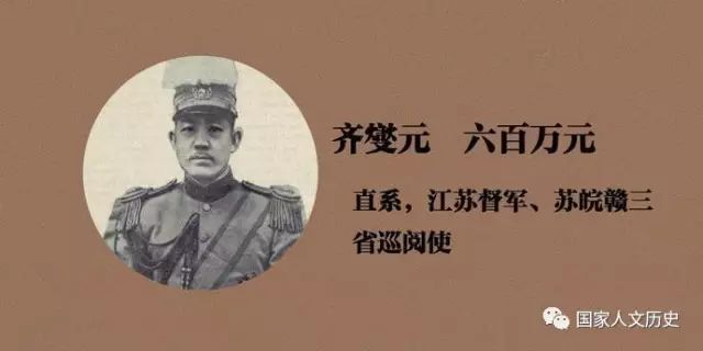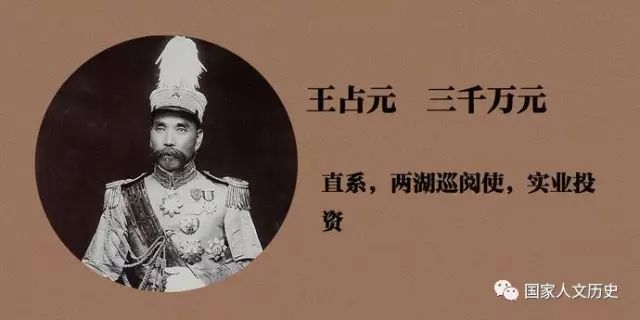 在《民视日报》的财产清单中,王占元以三千万元的规模居于前列。他出生于山东馆陶县(今属河北),早年参加淮军刘铭传部,之后参加了宋庆的毅军,1895年在天津小站加入袁世凯新军。此后逐渐升迁,1911年11月因从革命军手中夺下汉阳而升任陆军第二镇统制;1913年镇压二次革命有功而获得陆军上将军衔。1915年王占元支持袁世凯称帝,被授予“壮威将军”头衔和“一等侯”的爵位。袁世凯死后,王占元成为湖北督军兼民政长,也是直系“长江三督”之一(另外两人是江苏督军李纯、江西督军陈光远,也都以善于聚敛钱财而著称)。