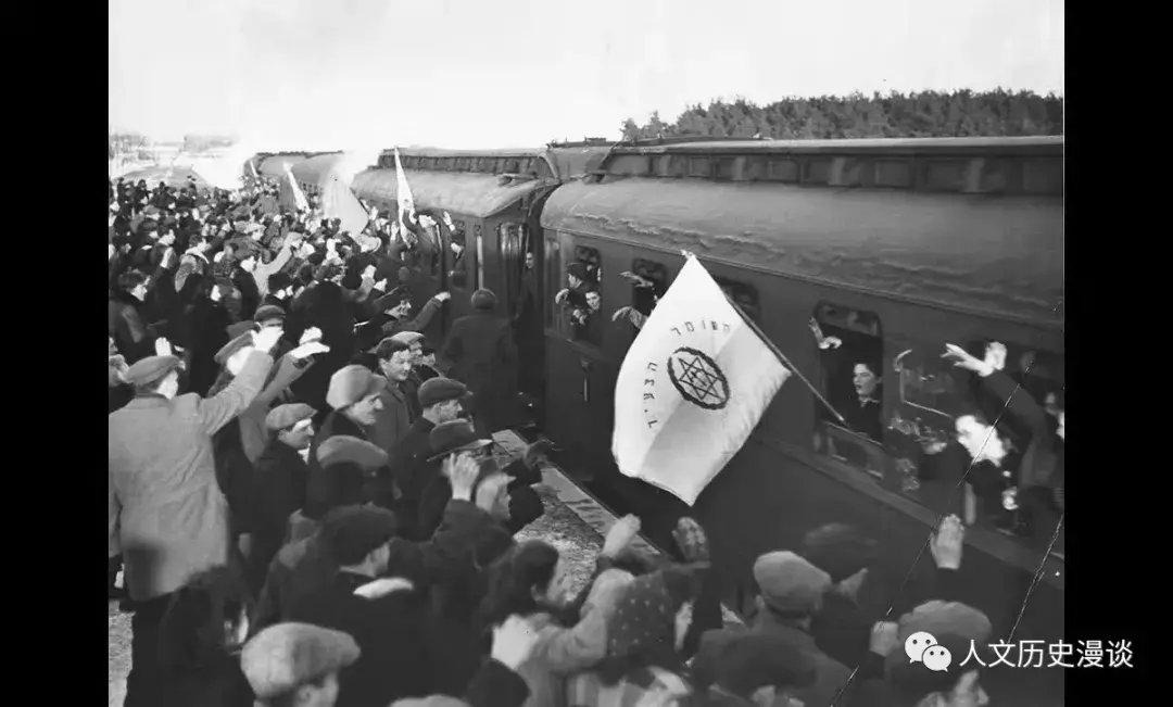 图:满载犹太人的火车从卑尔根-霍恩车站开出前往巴勒斯坦地区