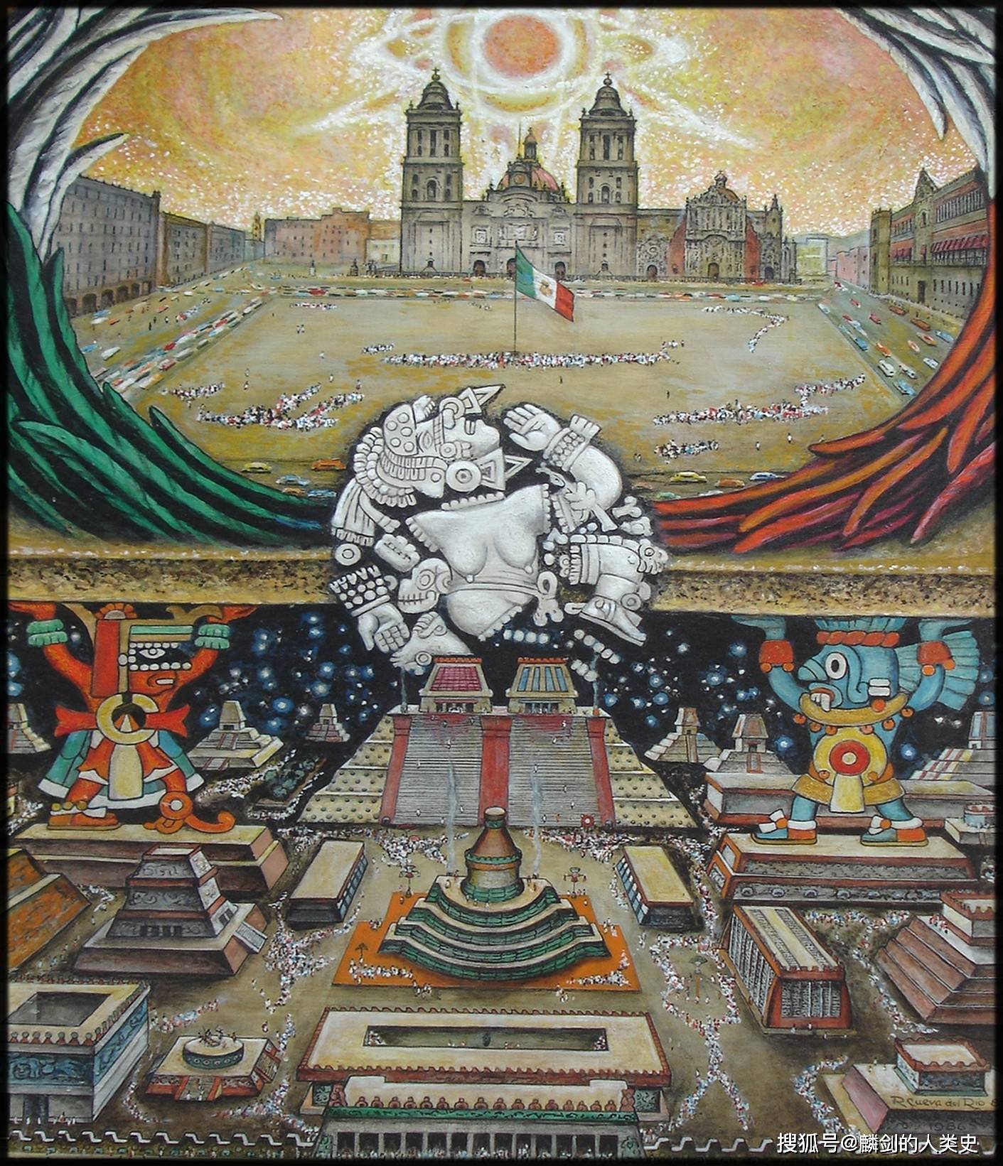阿兹特克人在战斗中为库瓦坎服务后,一位库族公主获得了佣兵的指挥权,但是阿兹特克人将她活剥做了祭品。根据当地人的讲述,阿兹特克人将她献给了战神、太阳神维齐洛波奇特利。库瓦坎国王听后大怒,用军队将他们驱逐了出去。阿兹特克人随后四处跋涉,根据太阳神维齐洛波奇特利的指示往南来到阿纳瓦克谷的特斯科科湖;当他们来到湖中央的岛屿时,他们看到一只叼著蛇的老鹰停歇在仙人掌上,这个意像告诉他们应该在这里建造城市。1325年阿兹特克人在这个地方建立了特诺奇蒂特兰,一座巨大的人工岛,现在墨西哥城的中心。