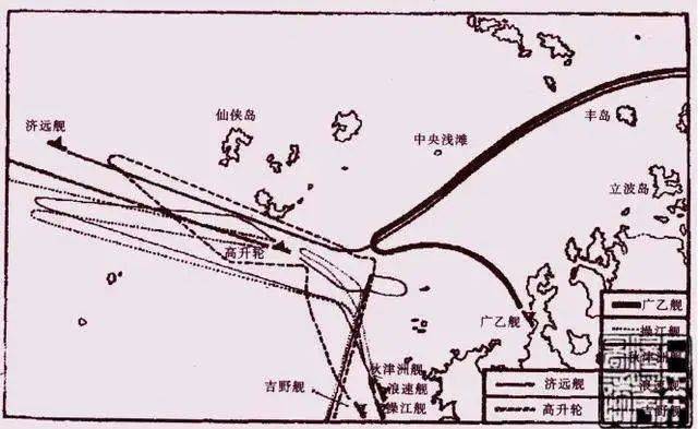 按日本联合舰队的既定作战计划,是以北洋舰队主力为袭击对象。但是,日本舰队于7月24日下午抵达朝鲜半岛西南端的里山岛附近时,由于情况不明,不敢继续前进,于是派第一游击队吉野、秋津洲、浪速三舰前去丰岛附近侦察,并下达命令曰:“如果中国舰队力量强大,则加以攻击。”(注:藤村道生《日清战争》,第89页。)可见,日本方面是企图偷袭中国海军大队的。因为前此大本营所得到的情报,是说中国海军大队出海,而在当时的通讯条件下,日本联合舰队不可能获悉停泊牙山湾的中国兵舰只有济远、广乙两艘。所以,当日舰第一游击队袭击济远、广乙时,其本队和第二游击队尚远在群山湾以南海面,无法赶到作战水域。若非如此,而是日本联合舰队以全队驶向牙山湾,则济远是绝不可能只舰逃还的。