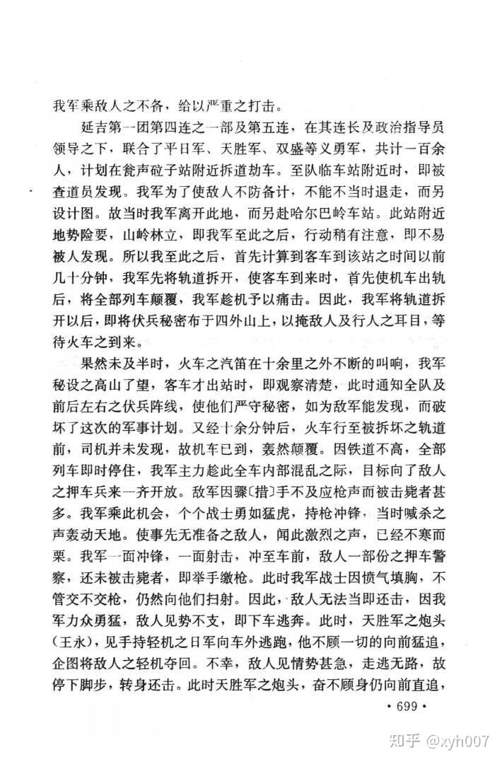 果然未及半时,火车之汽笛在十余里之外不断的叫响,我军秘设之高山了望,客车才出站时,即观察清楚,此时通知全队及前后左右之伏兵阵线.使他们严守秘密,如为敌军发现,而破坏了这次的军事计划。又经10余分钟后,火车行至被拆坏之轨道前,司机并未发现,故机车已到,轰然颠覆。因铁道不高,全部列车即时停住。我军主力趁此全车内部混乱之际,目标向敌人之押车兵一齐开放。敌军因骤(措]手不及应枪声而被击毙者甚多。我军乘此机会,个个战士勇如猛虎持枪冲锋,当时喊杀之声轰动天地。使事先无准备之敌人,闻此激烈之声,已经不寒而栗。