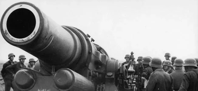 超重型炮兵是几个配备190 毫米火炮的加农炮连,另外几个榴弹炮、臼炮连配备了305 毫米、350 毫米、420 毫米火炮。我们还有两种特种火炮,其中一种口径600 毫米,另一种是著名的“多拉”,口径高达800 毫米。“多拉”最初的设计目的是对付马其诺防线最坚固的工事,但后来没有用上。它堪称火炮技术的奇迹,身管长30 米左右,炮架有两层楼那么高,把这头怪兽置入专用轨道需要动用60 节车皮。为保障这门巨炮的安全,两个高炮营时刻守护左右。总的说来,这门火炮的能效比很不合算,不过,它射出的一发炮弹摧毁了谢韦尔纳亚湾北部边缘敌人设在岩石下方30 米的一座大型弹药库。
