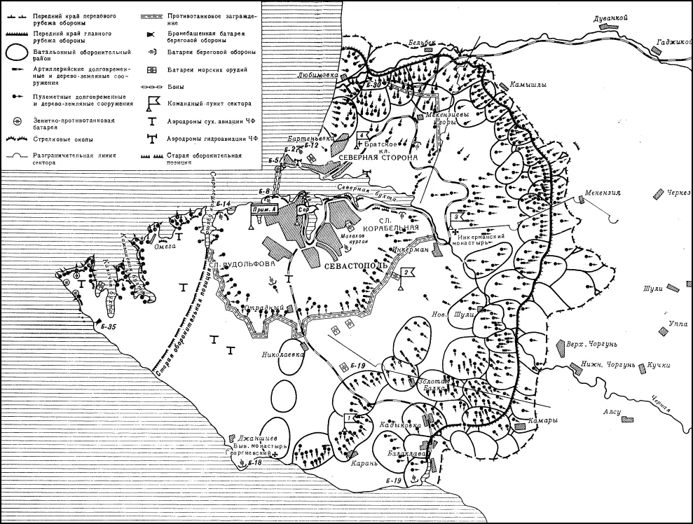 就算进攻方夺取这处制高点阵地,也不等于肃清了通道。岸边还有许多海岸炮台,其中包括现代化的马克西姆·高尔基Ⅱ号装甲炮台。接下来还有一道连贯的半圆形阵地,从谢韦尔纳亚湾的因克尔曼起,一路延伸到斯特列列茨卡亚湾附近的塞瓦斯托波尔要塞西面。这道阵地设有防坦克壕、铁丝网、无数碉堡。塞瓦斯托波尔东南面,克里木战争中的英军公墓也改造成强大的炮台网。