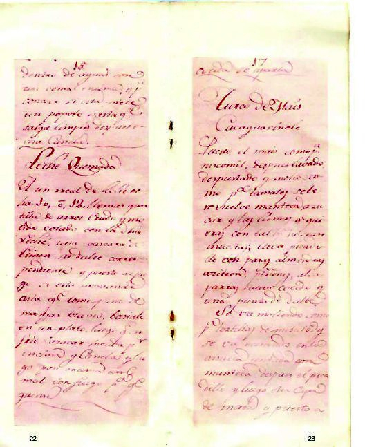 阿兹特克人没有文字,龙舌兰纤维纸本上有一些宴请、烹调的画面,以记录节庆、事件为主,不以“烹饪教学”为目的。此后几百年,日常的技术一直在低阶的厨师厨娘间口口相传,而上流社会尊崇西班牙饮食传统——胡安娜在随侍总督夫人的五年间,熟读了巴塞罗那公爵厨师德·诺拉的《烹饪书》,也就是神圣罗马帝国皇帝查理五世推崇的《炖菜谱》,以及蒙蒂尼奥(从菲利普二世到四世,连任34年御厨)广为流传的《烹饪、糕点、饼干及腌制艺术》。