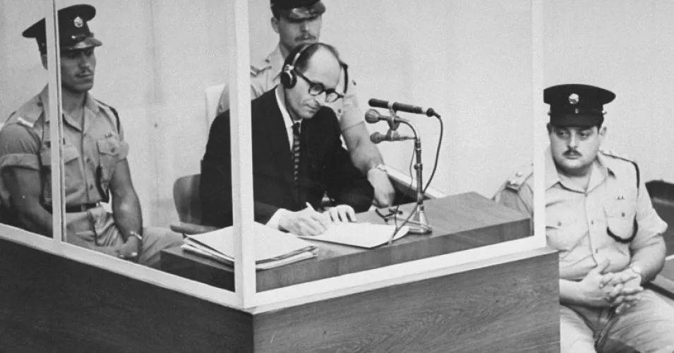 二战结束后,纳粹头号战犯,也是在犹太人大屠杀中执行“最终方案”的主要负责者阿道夫·艾希曼(Adolf Eichmann,1906-1962),1961年于耶路撒冷受审,被以人道罪名等十五条罪名起诉,1962年处以绞刑。