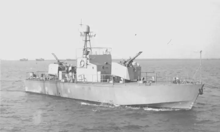 图11.1964年8月2日夜遭美军“星座”号航空母舰舰载机反击的三艘北越P-4型鱼雷艇当中的一艘