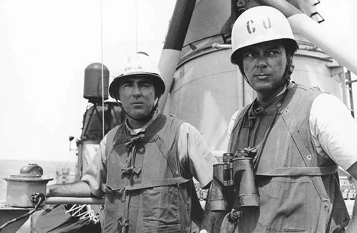 图8.执行“德索托”任务的指挥官约翰·赫里克上校(左)和舰长赫伯特·奥吉尔中校在“马多克斯”号驱逐舰上,照片摄于1964年8月