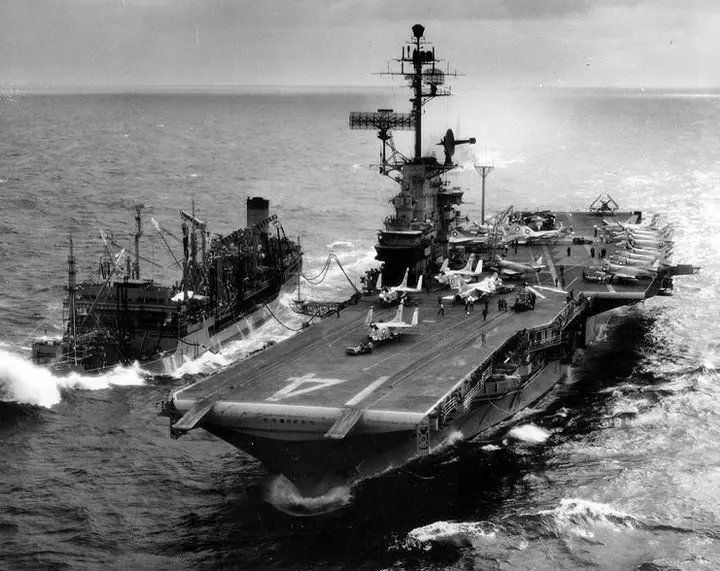 图2.越南战争期间的“提康德罗加”号航空母舰,可见大改装后的甲板和上面停放的喷气式舰载机,照片摄于1966年年初,地点是越南外海。旁边并行的是“阿什塔比拉”号油轮(AO-51)