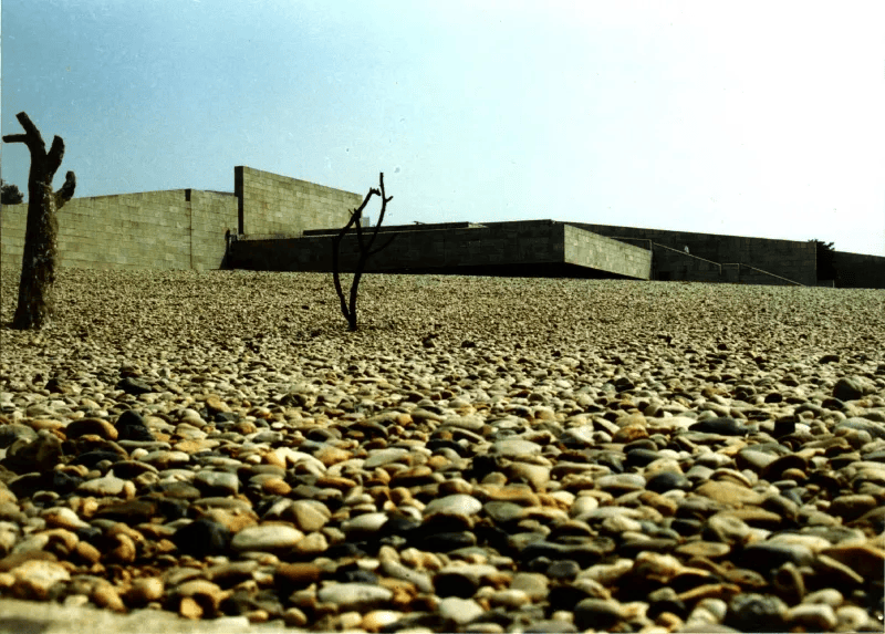 广场的整个地面都被卵石覆盖,纪念馆的气氛严肃、 凝重。卵石地面寸草不生,呈现出 劫难的情景,象征 死亡。而在沿边以及石台阶上种上草皮,代表一种 “生”的追求,形成强烈的 “生和死”的对比。