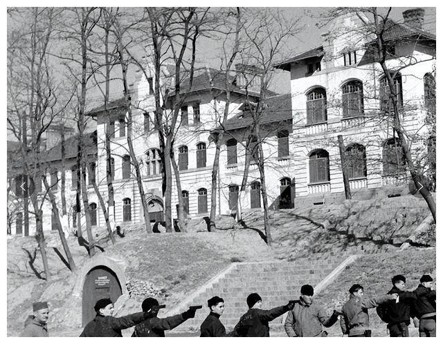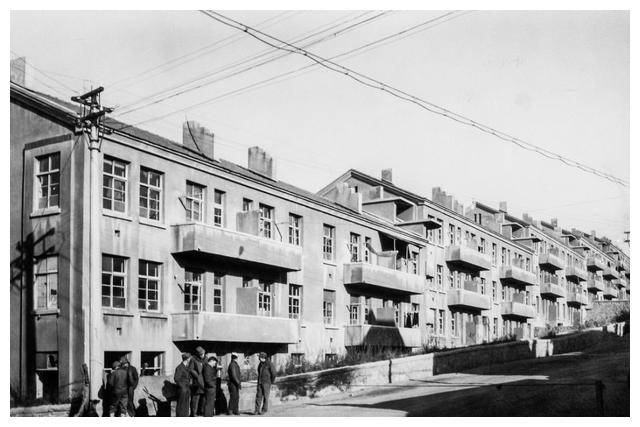 合江路山东大学第二公舍,前身为日本人建的大型公寓,美军登陆青岛,临时作为美军兵营。图为美军在日本公寓前。